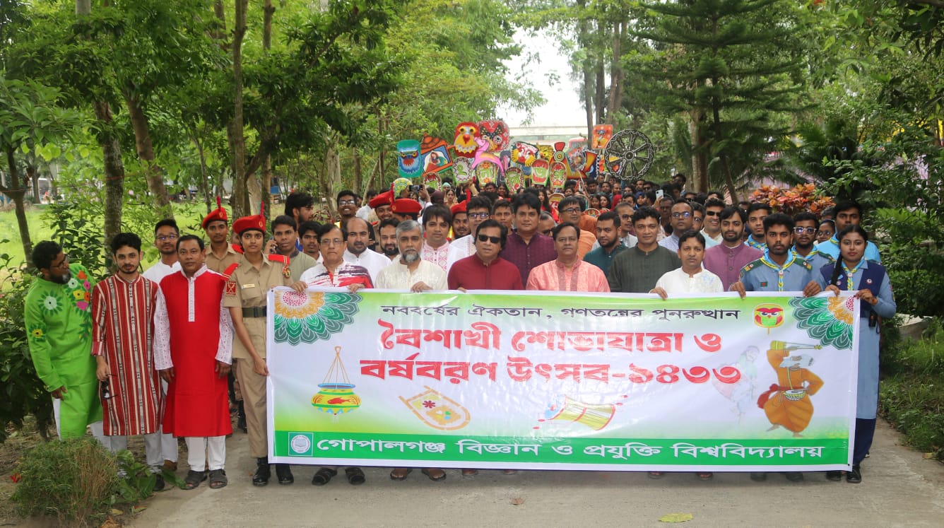 ‘নববর্ষের ঐকতান, গণতন্ত্রের পুনরুত্থান’ এই প্রতিপাদ্যকে সামনে রেখে গোপালগঞ্জ বিজ্ঞান ও প্রযুক্তি বিশ্ববিদ্যালয়ে উৎসবমুখর পরিবেশে নানা আয়োজনে বাঙালির প্রাণের উৎসব পহেলা বৈশাখ উদযাপন করা হয়েছে।