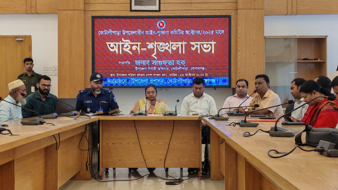 গোপালগঞ্জের কোটালীপাড়ায় আইন শৃঙ্খলা সভা অনুষ্ঠিত হয়েছে। আজ বৃহস্পতিবার(২৩ অক্টোবর) সকাল ১০ টায় উপজেলা পরিষদ হলরুমে এ সভার আয়োজন করে উপজেলা প্রশাসন।