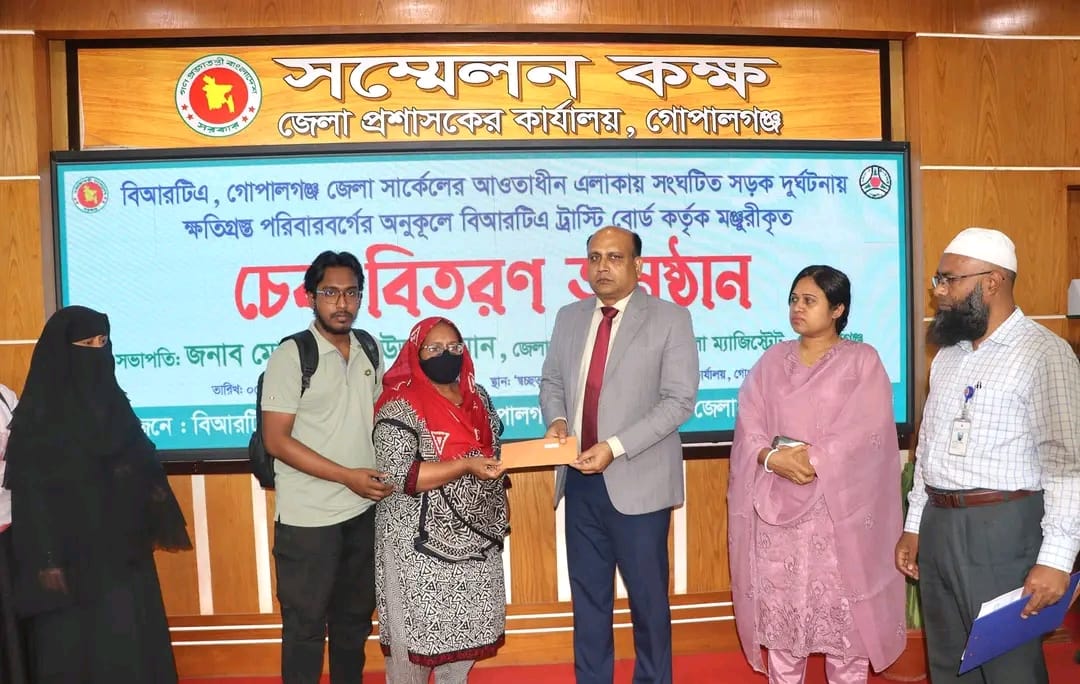 সড়ক দুর্ঘটনায় নিহতদের পরিবারের সদস্যদের মাঝে আর্থিক সহায়তার চেক বিতরণ করা হয়েছে।বৃহস্পতিবার (০৫ মার্চ) দুপুরে জেলা প্রশাসকের কার্যালয়ে নিহত আটটি পরিবারের মাঝে মোট ৪০ লাখ টাকার অনুদানের চেক তুলে দেওয়া হয়।জেলা প্রশাসক মোঃ আরিফ-উজ-জামান প্রত্যেক পরিবারের হাতে পাঁচ লাখ টাকা করে এই অনুদানের চেক প্রদান করেন। বাংলাদেশ সড়ক পরিবহন কর্তৃপক্ষ (বিআরটিএ) ট্রাস্টি বোর্ডের উদ্যোগে এই অনুদান প্রদান করা হয়।অনুদানপ্রাপ্তরা হলেন—গোপালগঞ্জ সদর উপজেলার ডুমদিয়া গ্রামের গাজী মো. হাফিজুর রহমান, রুহুল আমীন খান ও দুলাল খান; গোপীনাথপুর গ্রামের মো. অলিদ হাসান খান; ইছাখালী গ্রামের বাধন হাসান; দুর্গাপুর গ্রামের মাহিম বিল্লাহ; কাজুলিয়া গ্রামের একরাম শেখ এবং চুয়াডাঙ্গা জেলার দামুড়হুদা গ্রামের আলিশা মুসকান।চেক বিতরণ শেষে জেলা প্রশাসক নিহতদের স্বজনদের সঙ্গে কথা বলেন এবং তাদের বর্ণনা শোনেন। এ সময় তিনি প্রাপ্ত অর্থ সঠিকভাবে কাজে লাগিয়ে কর্মসংস্থান তৈরির জন্য পরিবারের সদস্যদের প্রতি আহ্বান জানান।অনুষ্ঠানে উপস্থিত ছিলেন অতিরিক্ত জেলা প্রশাসক (রাজস্ব) রুলী বিশ্বাস, বিআরটিএর সহকারী পরিচালক মো. হাবিবুর রহমান, নির্বাহী ম্যাজিস্ট্রেট আতাউর রহমান, বিআরটিএ অফিস সহকারী মোয়াবিয়া, মো. ইয়াছিনসহ সংশ্লিষ্ট কর্মকর্তা-কর্মচারীরা এবং নিহতদের পরিবারের সদস্যরা।