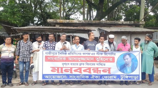 প্রতিনিধি, গোপালগঞ্জ: গাজীপুরে কর্মরত সাংবাদিক দৈনিক প্রতিদিনের কাগজ-এর স্টাফ রিপোর্টার আসাদুজ্জামান তুহিন হত্যাকাণ্ডের প্রতিবাদে গোপালগঞ্জের মানববন্ধন অনুষ্ঠিত হয়েছে। আজ রবিবার সকাল ১১টা ৩০ মিনিটে টুঙ্গিপাড়া পাটগাতী বাসস্ট্যান্ড “টুঙ্গিপাড়া সাংবাদিক ঐক্য